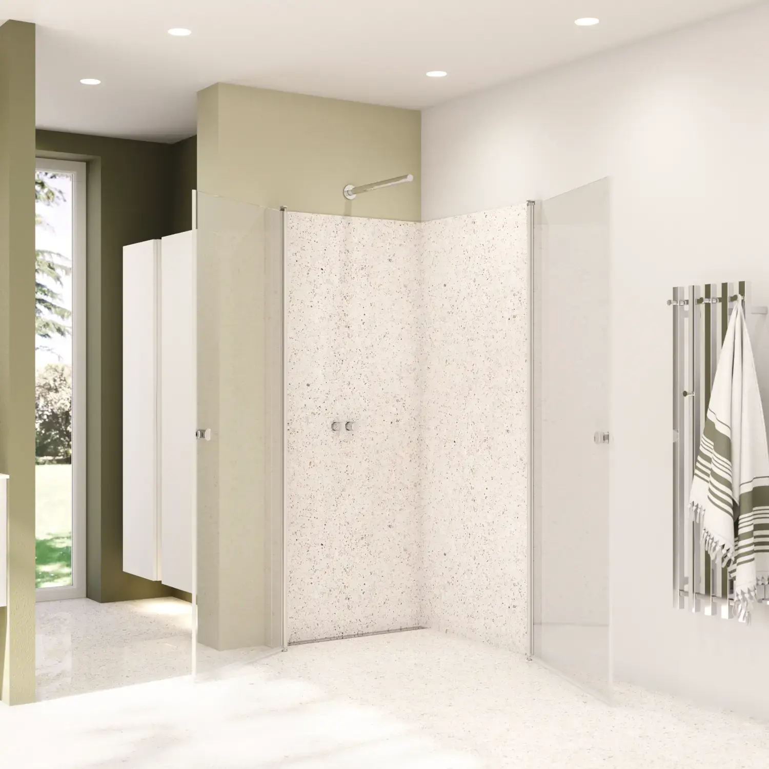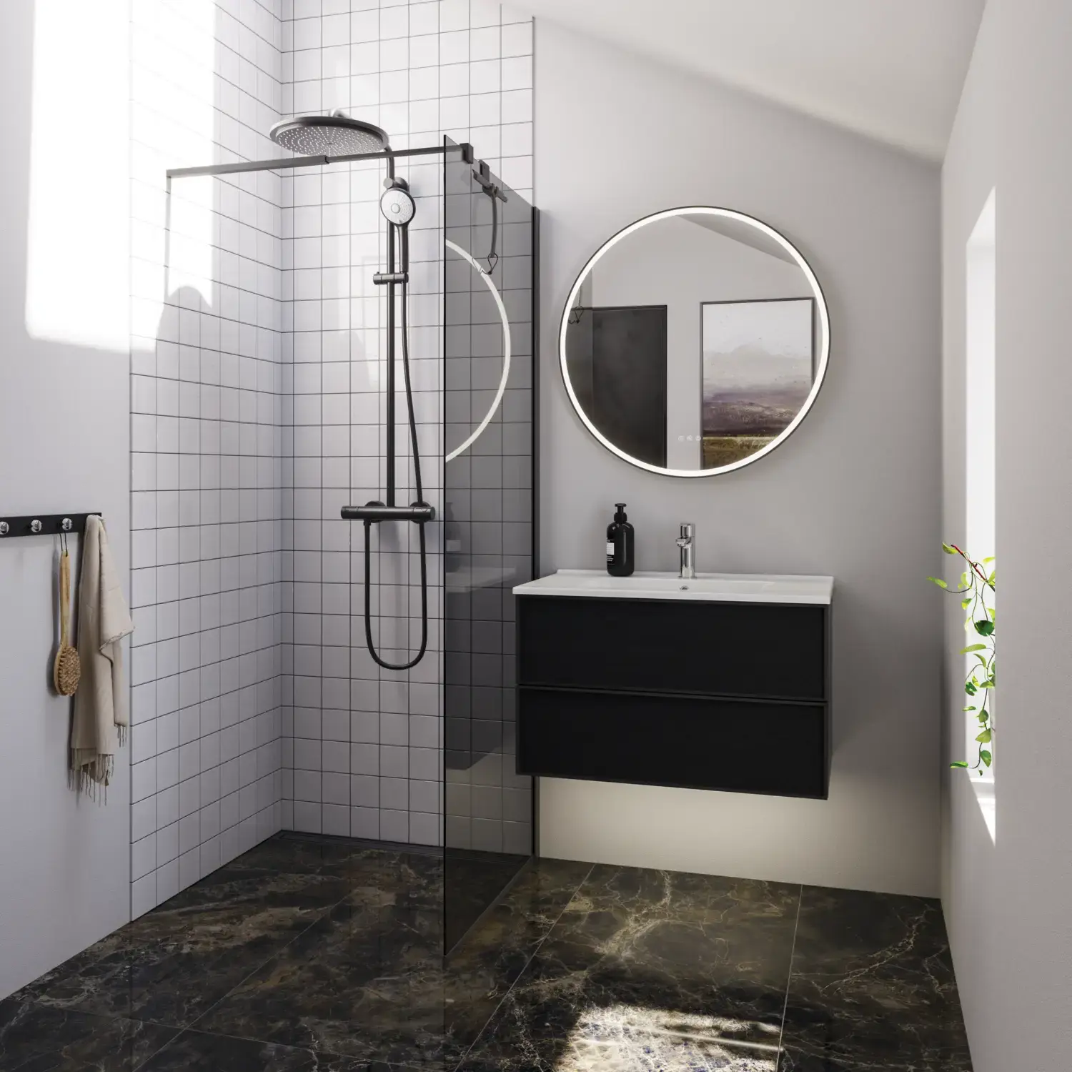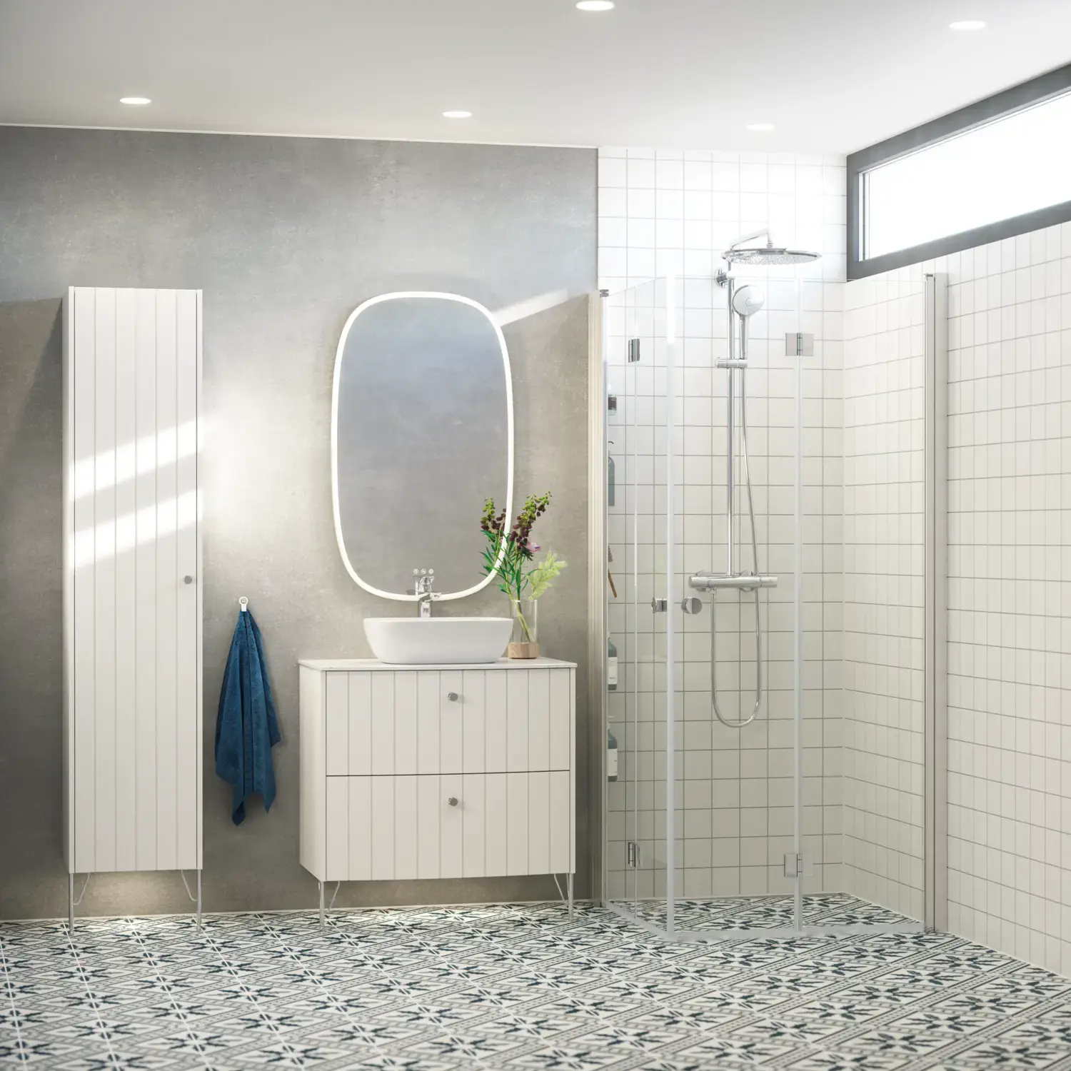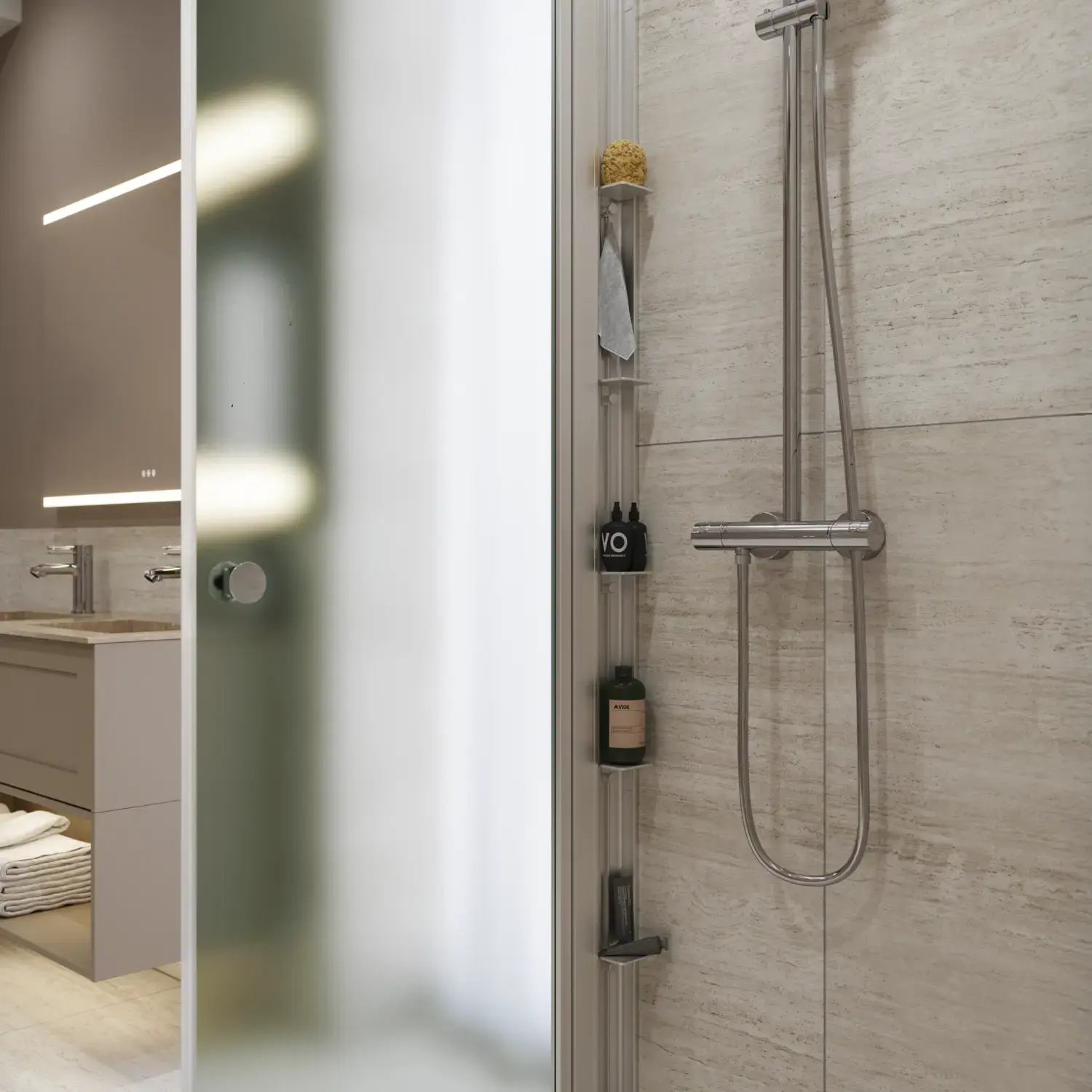 Duschväggar som optimerar utrymmet genom att möjliggöra nära placering av möbler intill väggen. Det ger dig möjlighet att exempelvis inkludera ett bredare tvättställ eller ett extra skåp. Två fasta väggar skapar en walk-in-lösning som ger rikligt med plats.