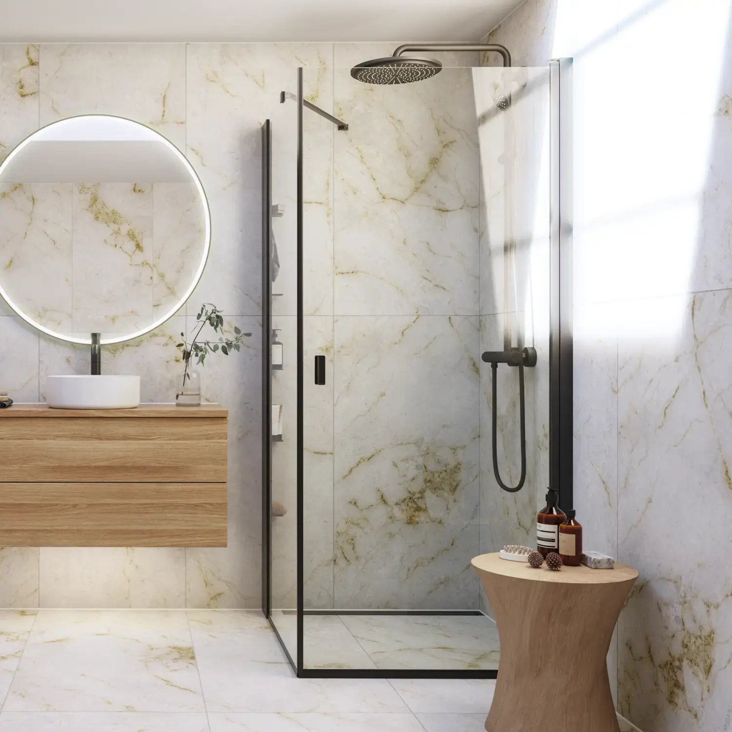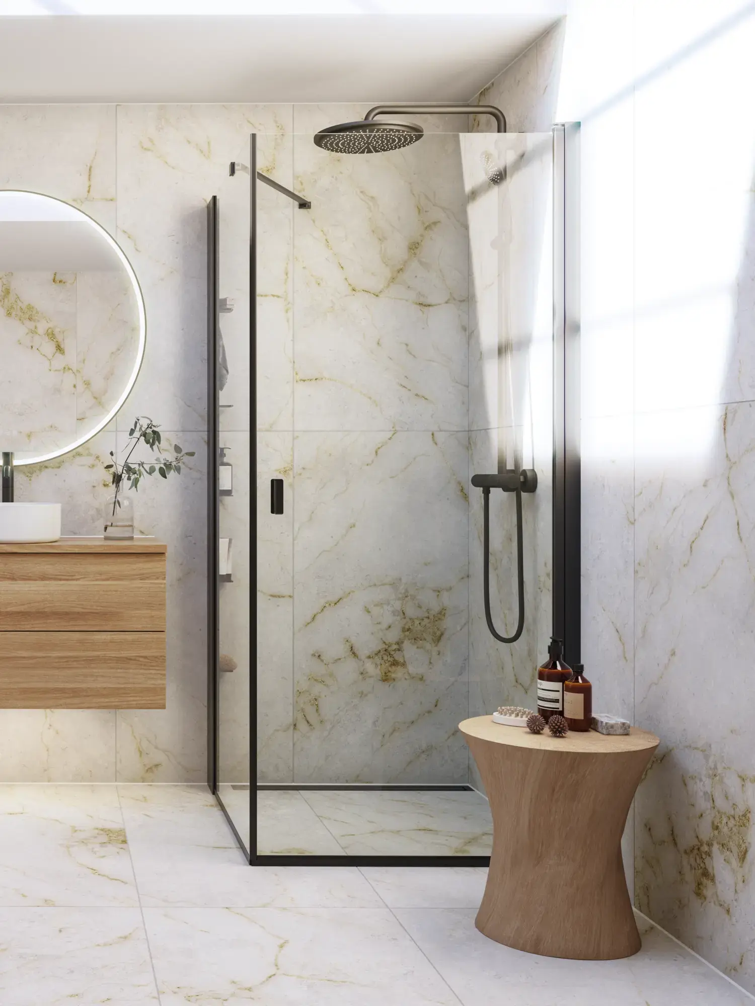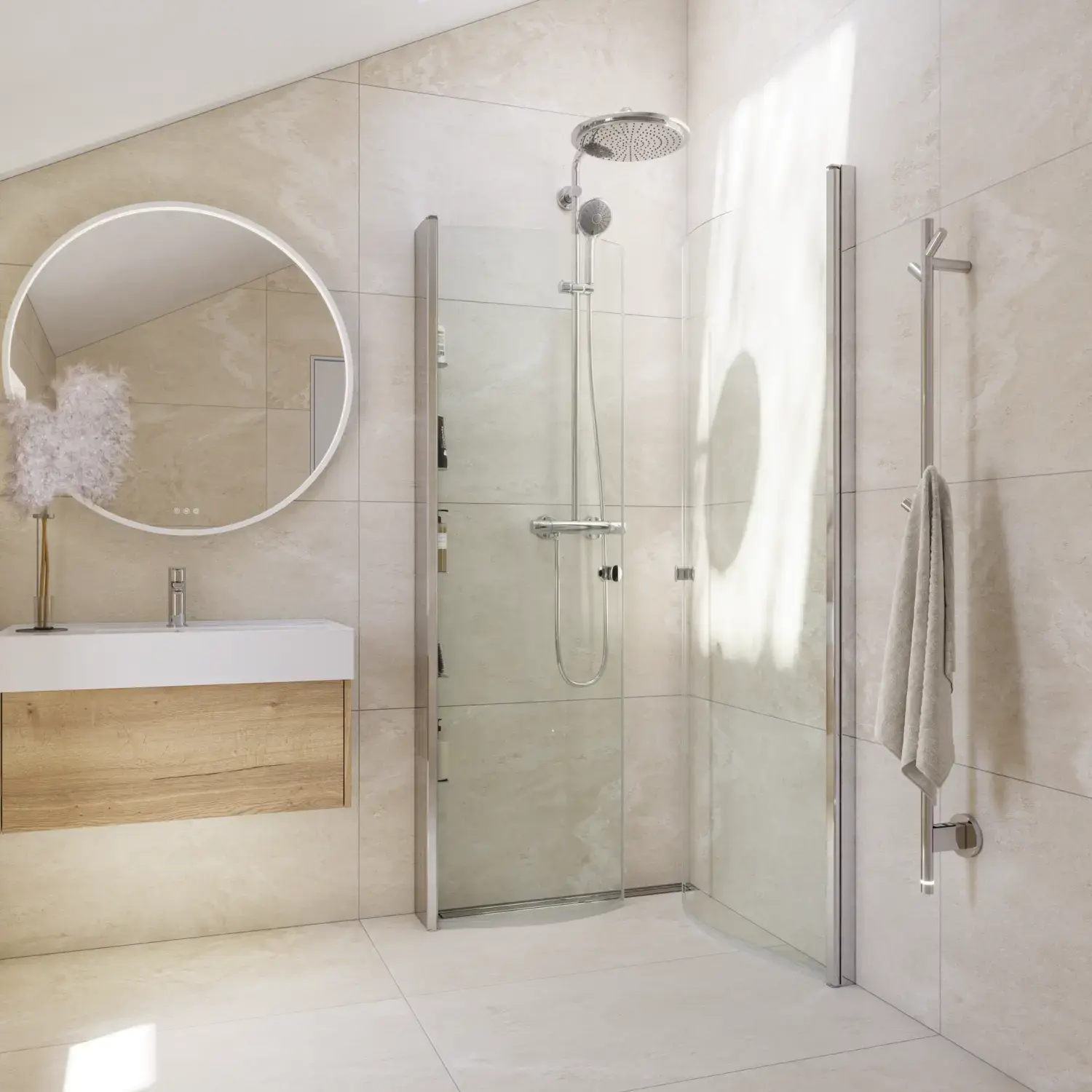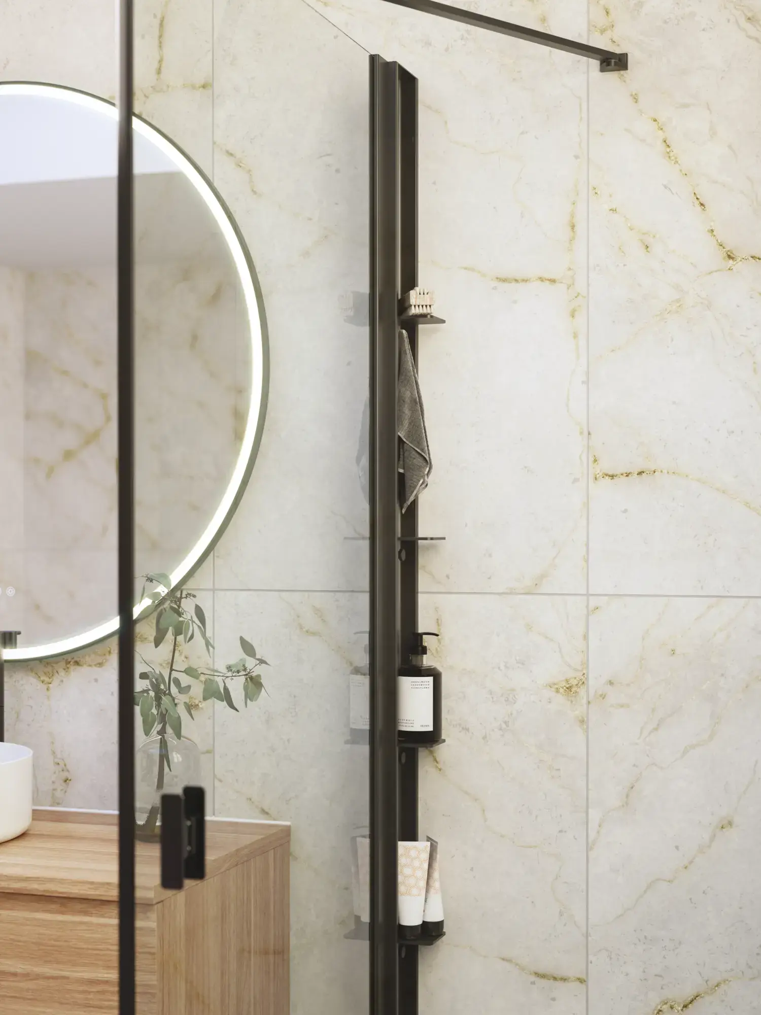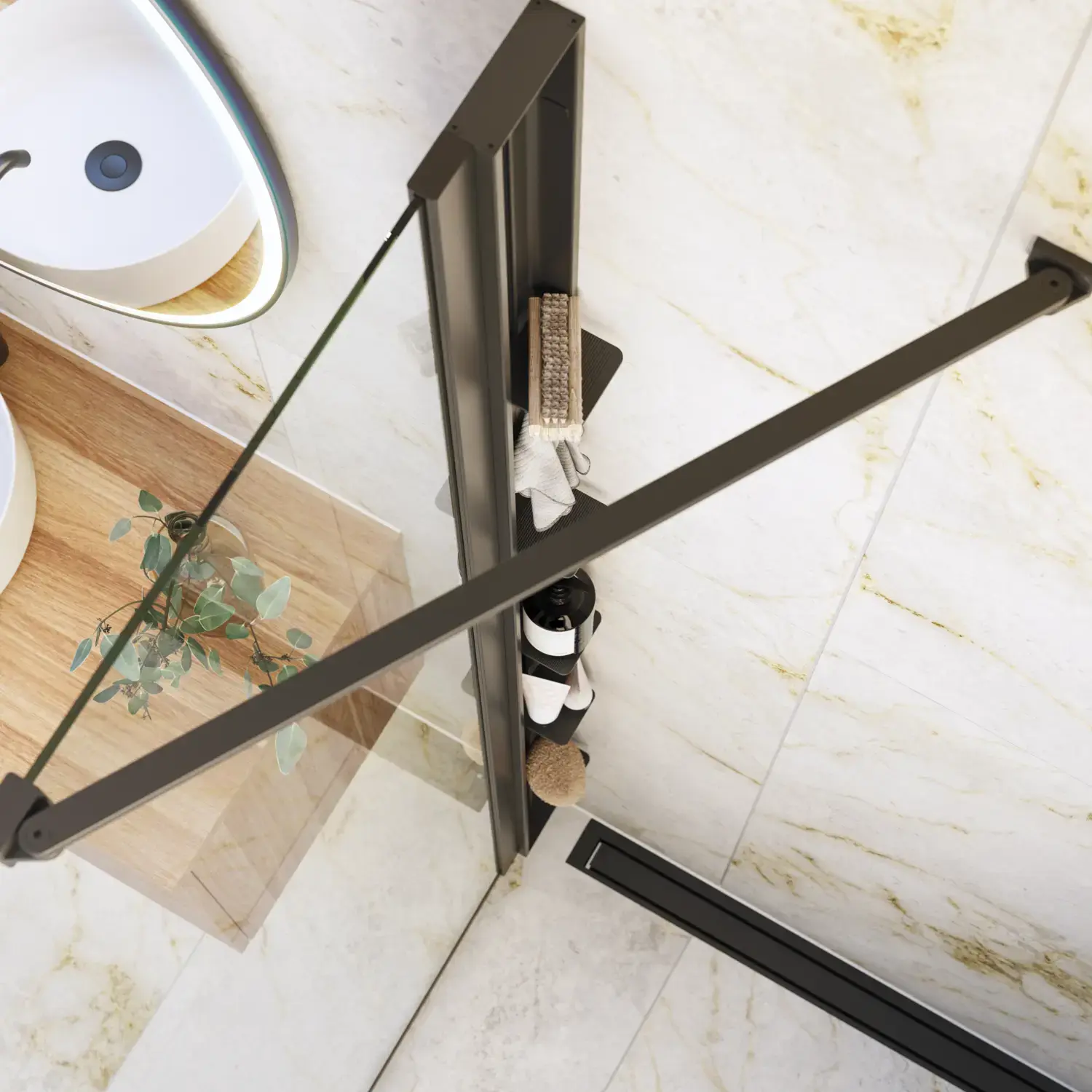 Duschväggar som optimerar utrymmet genom att möjliggöra nära placering av möbler intill väggen. Det ger dig möjlighet att exempelvis inkludera ett bredare tvättställ eller ett extra skåp. Två fasta väggar skapar en walk-in-lösning som ger rikligt med plats.