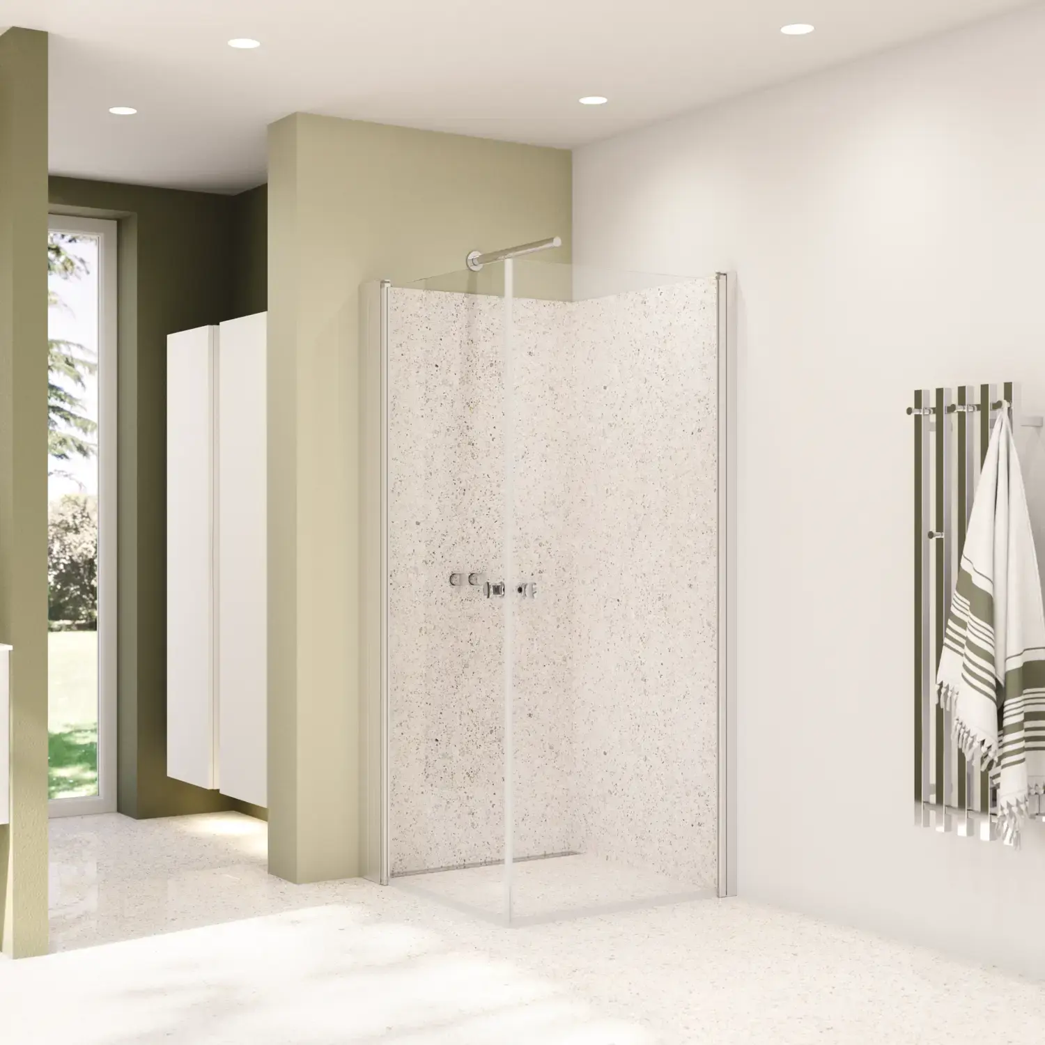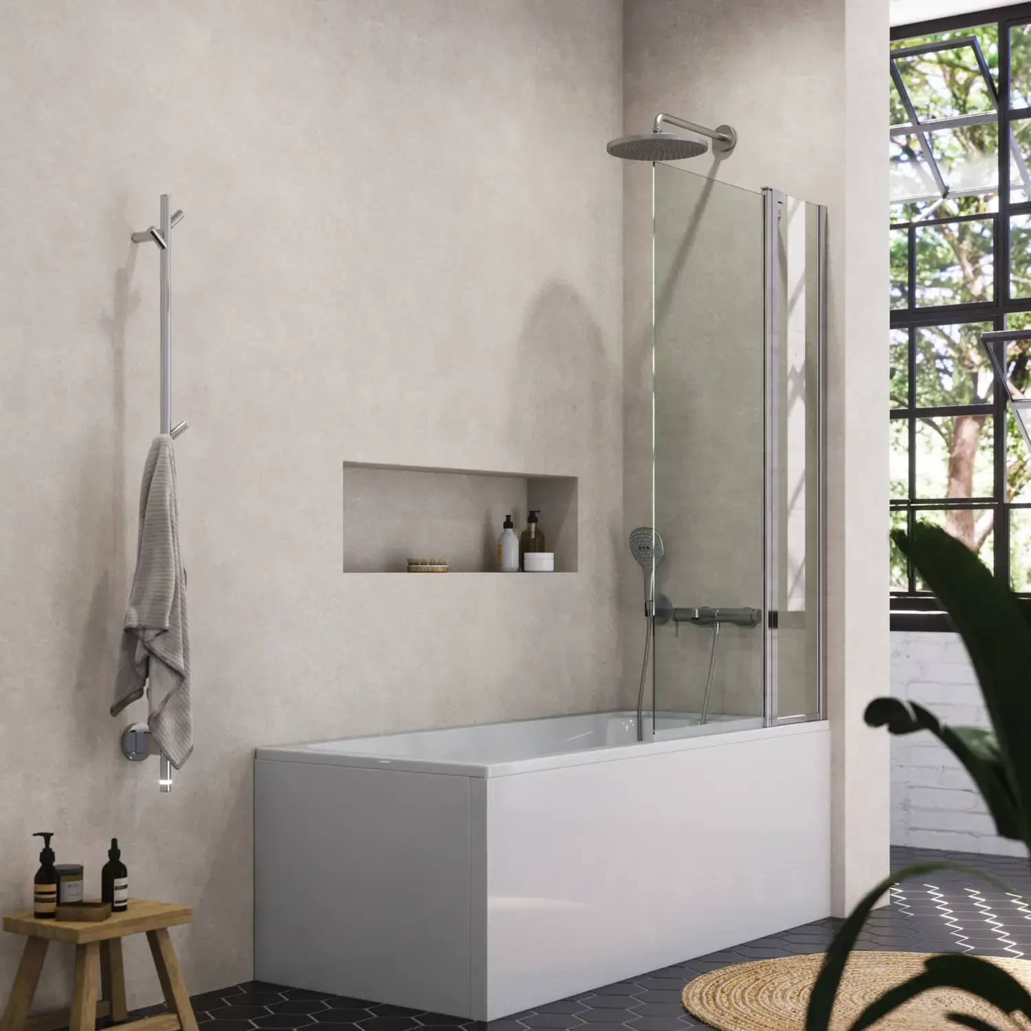 Säg farväl till duschdraperiet med en elegant badkarsvägg som skapar en känsla av mer utrymme i rummet. Glasdörren kan vikas in mot armaturen vilket minimerar utrymmesbehovet. Stabilisering medföljer.