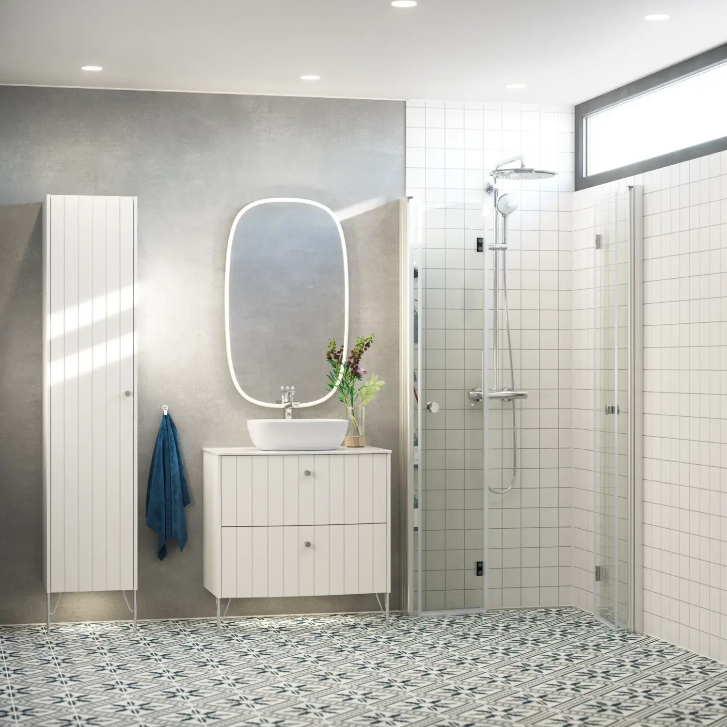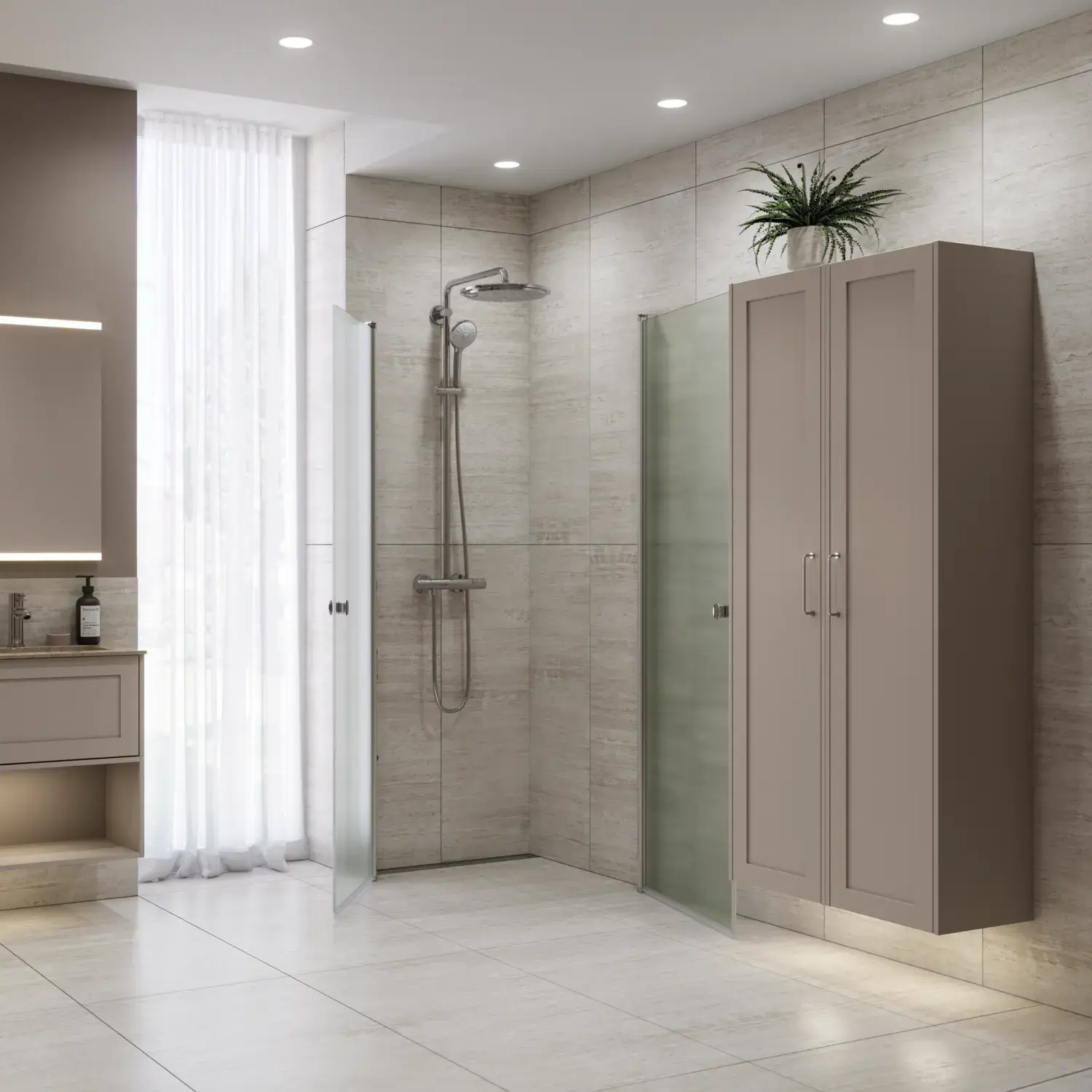 Om du har ett litet badrum, kan du utnyttja utrymmet ända intill duschen om du väljer en slagdörr med fast vägg. Dansani Match duschdörrarna kan vikas inåt för att ta så lite plats som möjligt.