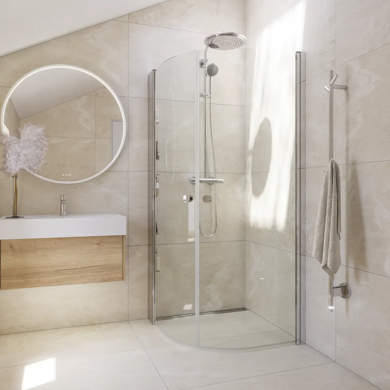 Två halvrunda duschdörrar från Dansani Match kan sättas ihop till en duschhörna. Dörröppning både utåt och inåt ger gott om plats när duschen inte används.