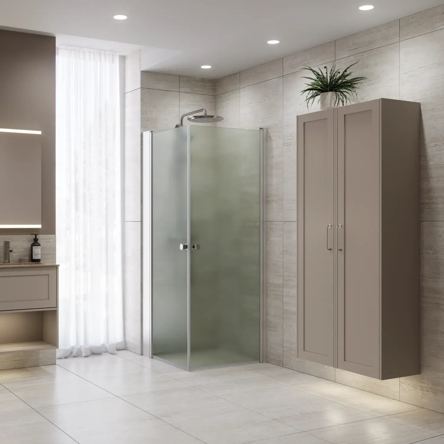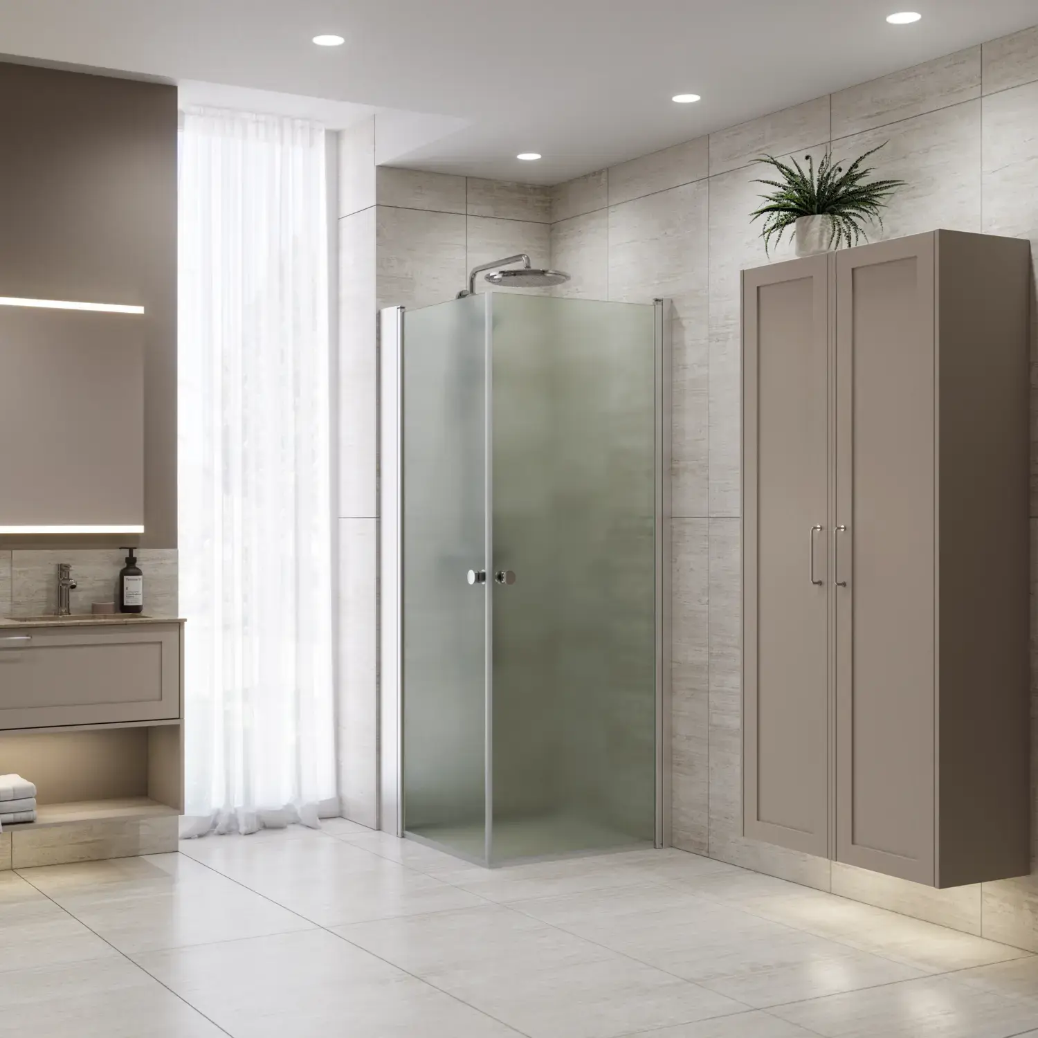 Dansani Match klassiska raka duschhörna med två dörrar som både kan öppnas utåt och inåt, när du inte använder de två duschdörrarna. Det frigör golvyta i ett litet badrum och öppnar upp rummet.