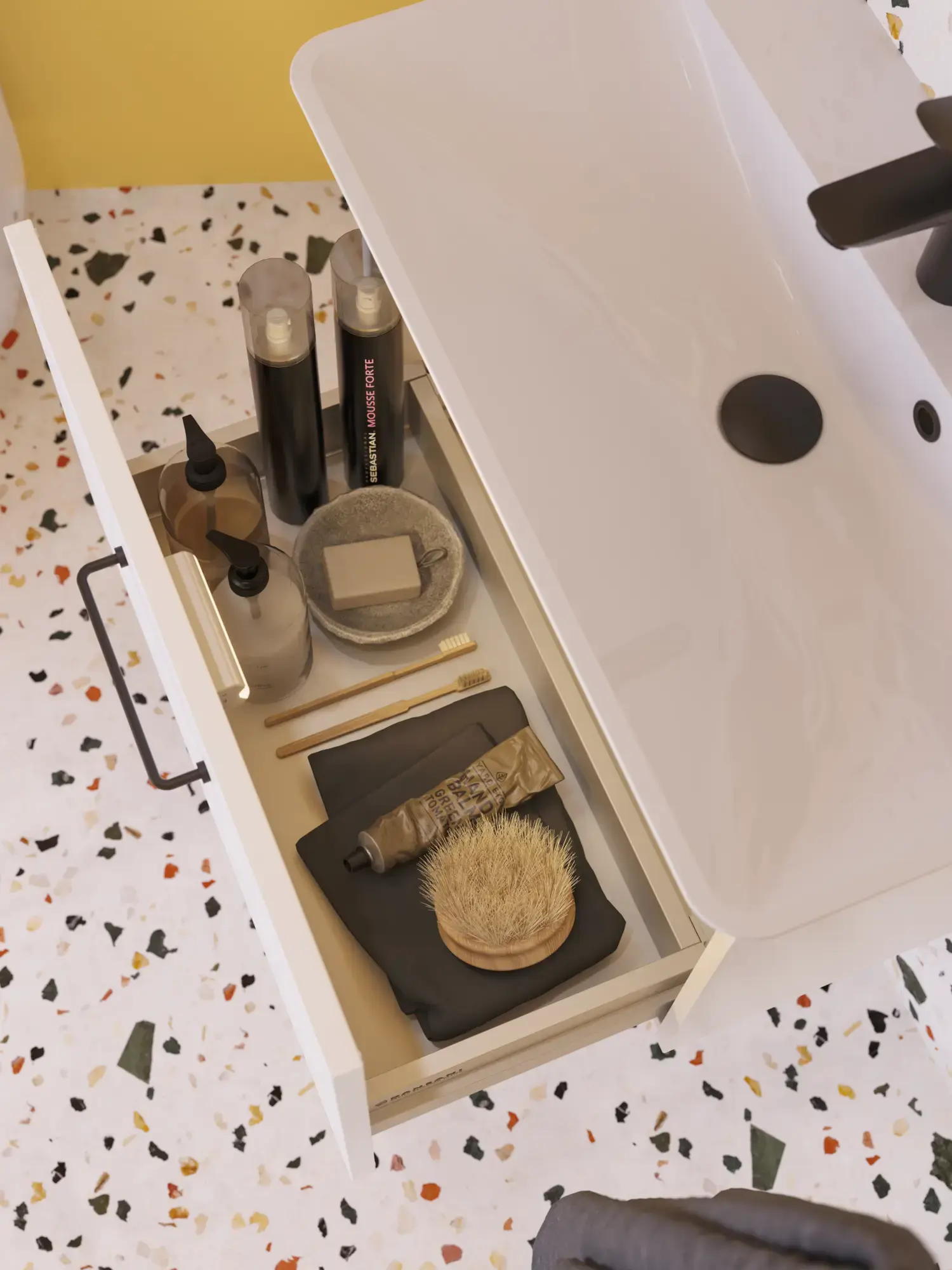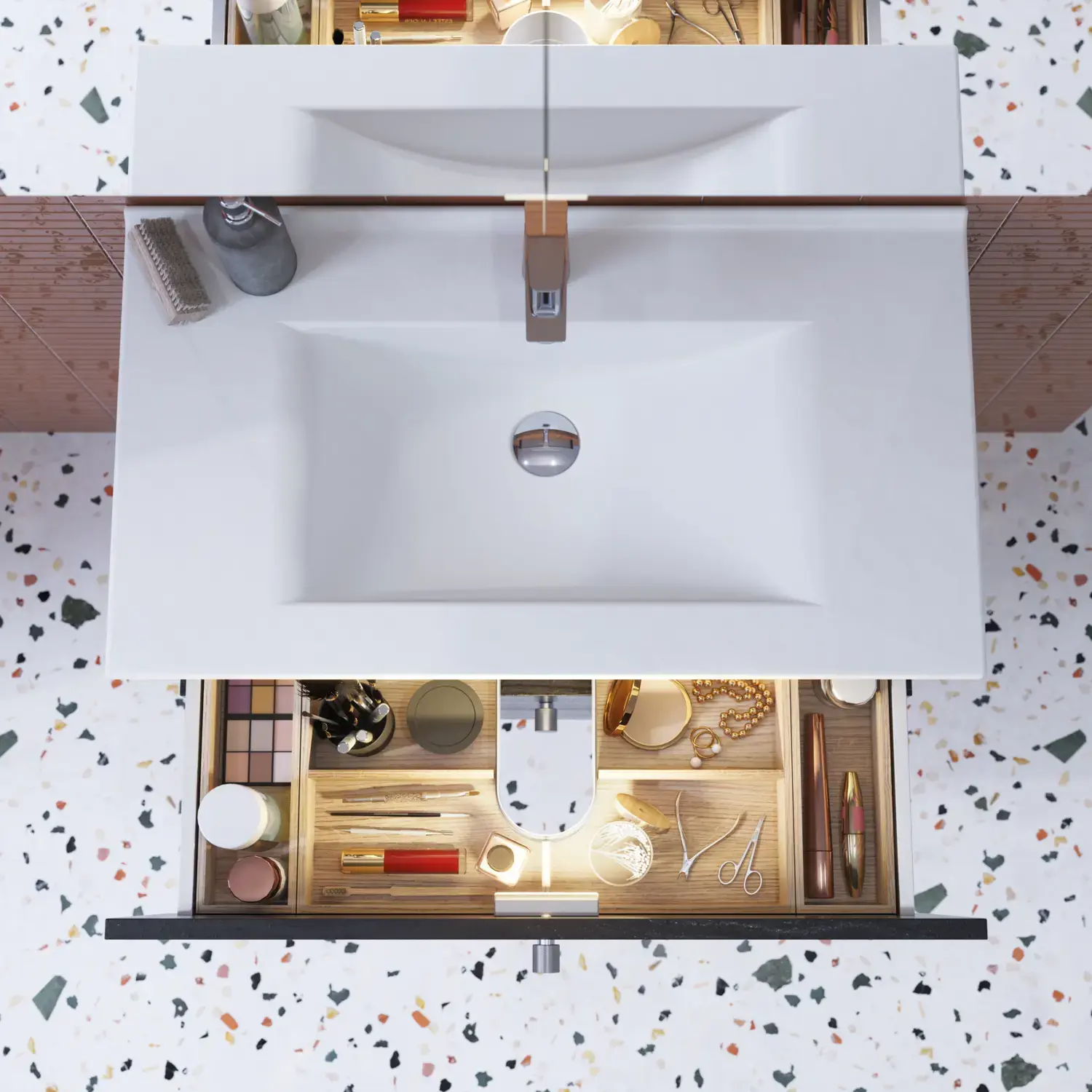 Bakom luckorna finns rikligt med utrymme, perfekt för handdukar, höga flaskor och liknande. De höga tvättställsskåpen med rymliga och fullt utdragbara lådor säkerställer enkel åtkomst till föremål längst in. Såväl luckor som utdragslådor har dämpad mjukstängning och kan finjusteras vid behov.