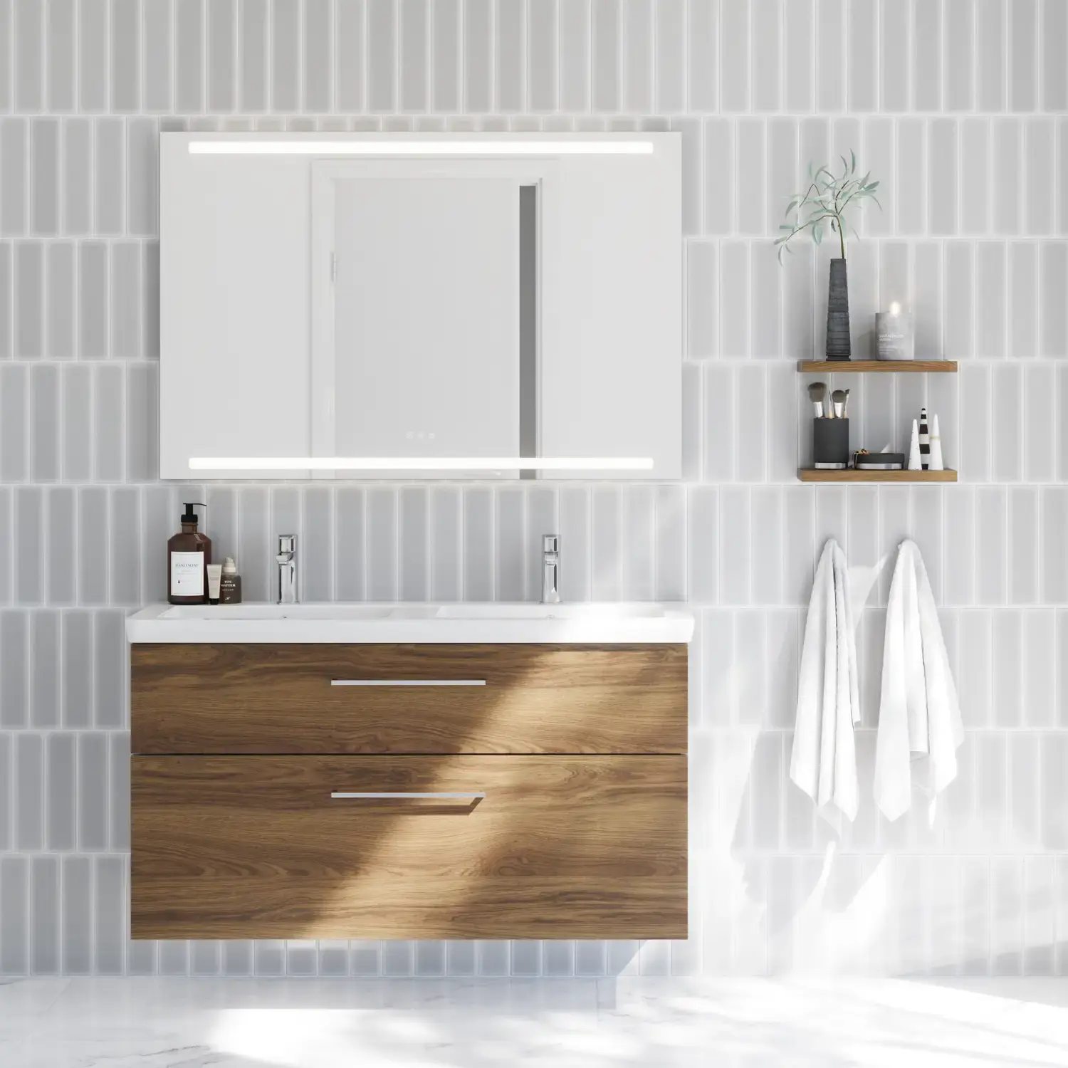 Har du ett dubbelt handfat? Då är en spegel på 120 cm det perfekta valet. Det säkerställer att båda handfaten har optimalt spegelutrymme, samtidigt som spegeln binder samman hela möbeln på ett harmoniskt sätt. En stor spegel skapar också mer lugn i badrummet än två mindre speglar. Den stora spegelytan lugnar ögat och gör att badrummet upplevs som mer harmoniskt.