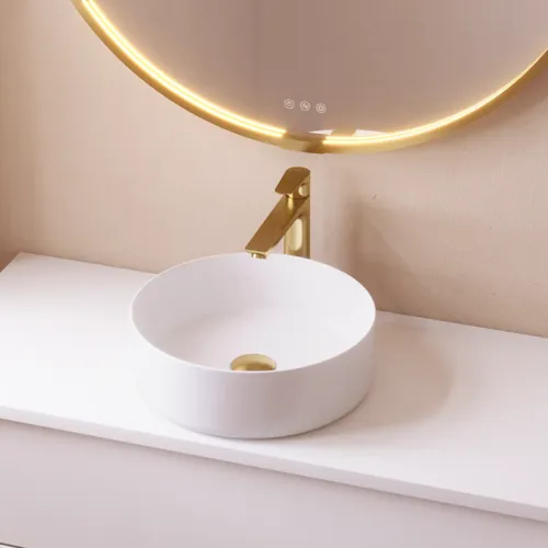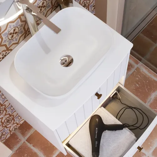 Vita ytor reflekterar ljuset och har en nästan magisk förmåga att få rummet att verka större och luftigare. En vit bänkskiva fungerar därför utmärkt i både små och stora badrum där den skapar lugn, balans och öppenhet. I Calidris-serien kan du få ett särskilt minimalistiskt uttryck med en tunn, vit kompositbänkskiva som svävar elegant över underskåpet. I Luna-serien ger kombinationen av en vit matt laminatbänkskiva och ett matchande porslinstvättställ ett stilrent men hemtrevligt uttryck. Oavsett materialval hjälper den vita färgen till att framhäva rummets detaljer – kakel, armaturer eller skåp – och skapar en helhet där ljus och material samspelar. Med möjlighet till specialmått anpassas bänkskivan exakt till ditt rum och stödjer en arkitektoniskt ren linjeföring. Det är det vita uttrycket när det är som bäst: funktionellt och poetiskt på samma gång.